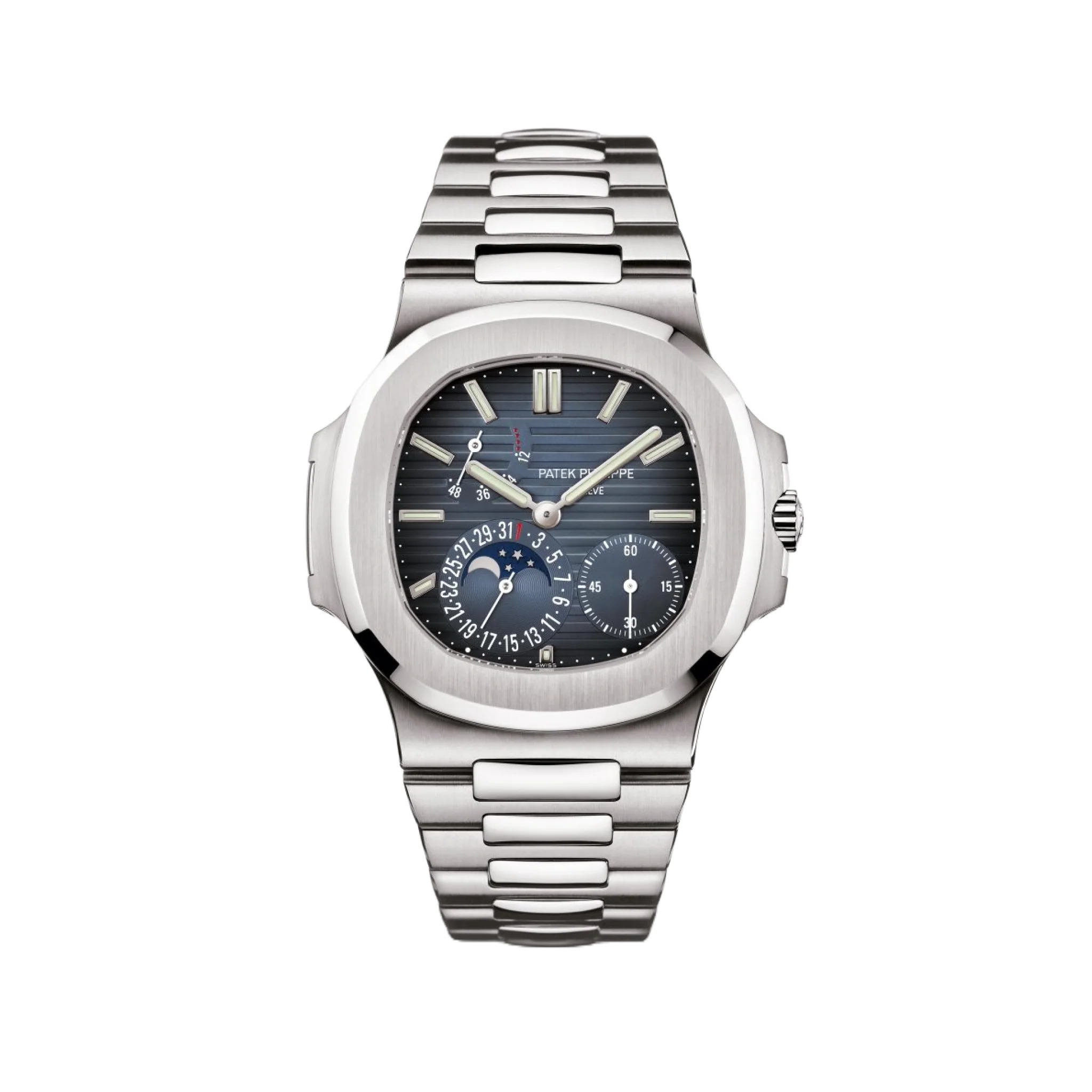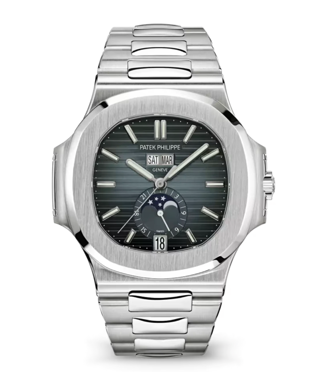 Patek Philippe Nautilus Annual Calendar Moon Phases Steel and Sunburst blue-gray dial Steel fold-over clasp bracelet Ref. 5726/1A-014